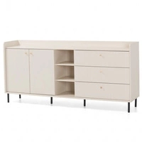 Komoda Ferdi 154 cm pískově béžová elegantní komoda do obývacího pokoje se zlatými kovovými úchyty vysoké okraje horní desky