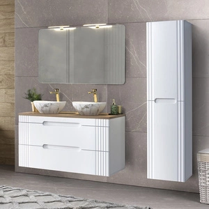 Romantická sada koupelnového nábytku bílá elegantní dřevěné skříňky do koupelny v klasickém stylu vkusné kovové úchytky