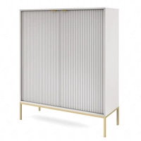 RTV skříňka Plisii 172 cm bílá / bílý lesk se závěsem a policemi stylový design, který se hodí do každého interiéru