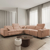 Rohová sedačka s funkcí spaní Nausa III pudrově růžová levá sametová stylová pohodlná rohová sedačka nastavitelné opěrky hlavy kontejner na lůžkoviny