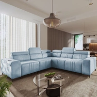Rohová sedací souprava s funkcí spaní Castel III modrá levá rohová sedací souprava se dvěma kontejnery na lůžkoviny s nastavitelnými opěrkami hlavy