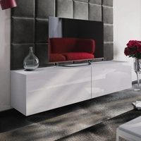 Závěsná RTV skříňka Astros 172 cm bílá / bílý lesk s policemi minimalistický a elegantní design, který se hodí do každého interiéru