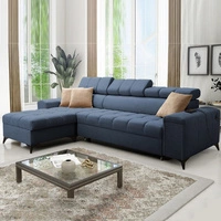 Rohová sedací souprava Kelly IV s funkcí spaní modrá levá sametová pohodlná rohová sedací souprava nastavitelné opěrky hlavy boční čalounění s lištami