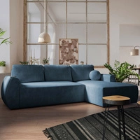 Rohová sedací souprava s funkcí spaní Colio modrá pravostranná stylová rohová sedací souprava se zajímavým tvarem velurové tkaniny s dekorativním polštářem koule