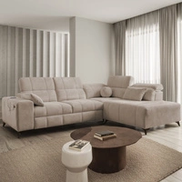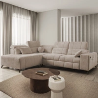 Rohová sedací souprava s funkcí spaní Penejos VII béžová pravostranná stylová rohová sedací souprava s úložným prostorem na lůžkoviny pohodlné polohovatelné opěrky hlavy