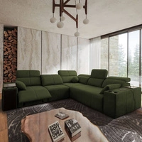 Rohová sedací souprava s funkcí spaní Tesalia III Lux zelená levá pohodlná rohová sedací souprava s výsuvnou podnožkou a posuvnou funkcí opěradla