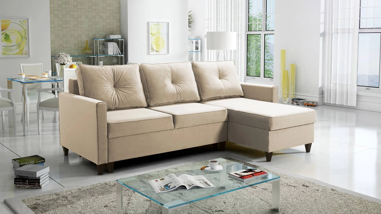 Rohová sedací souprava s funkcí spaní Terni krémová pravý roh praktická a funkční, vybavená prostornými nádobami na lůžkoviny