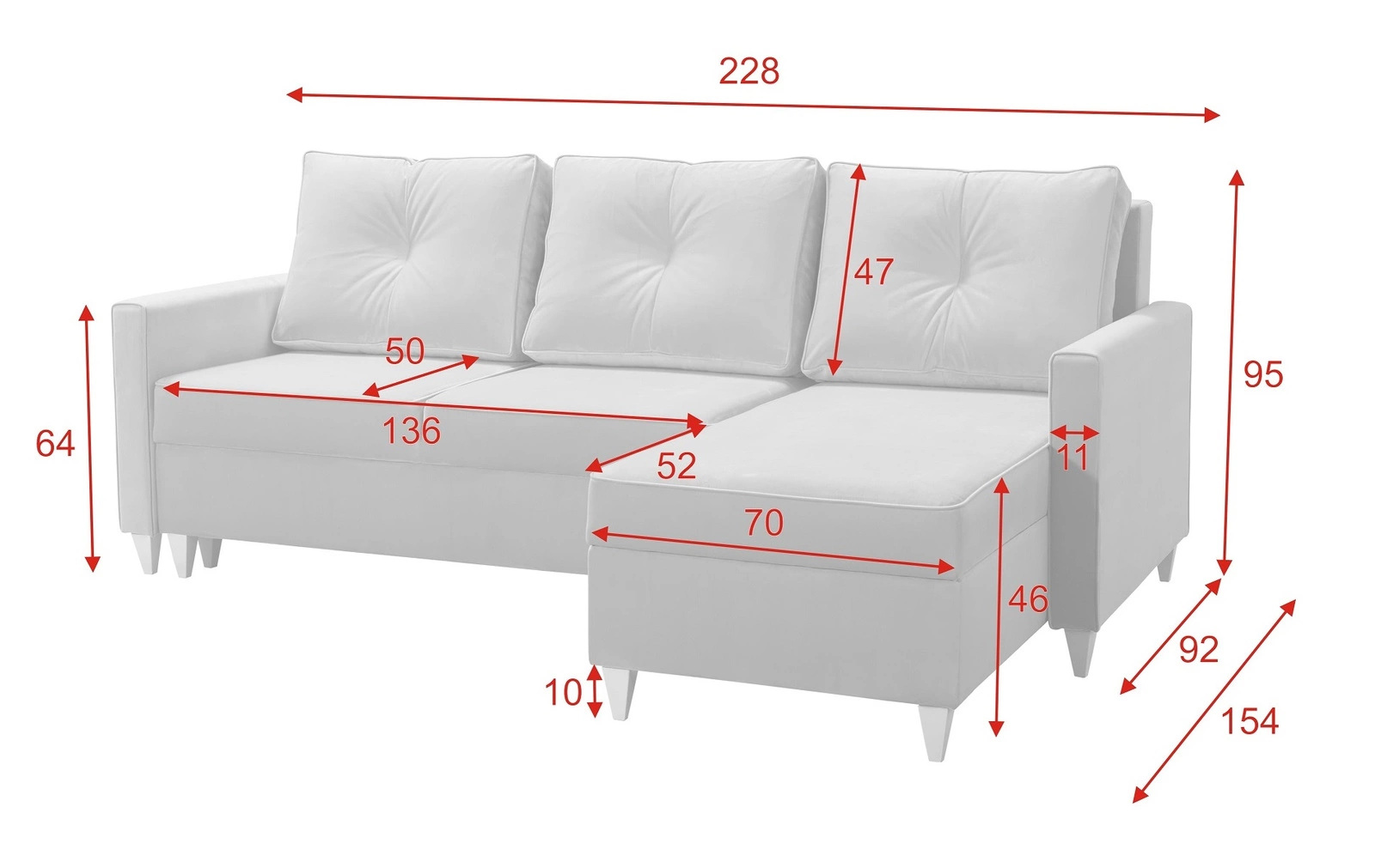 Rozměry nábytku jsou optimální. Šířka rohu 228 cm, výška 95 cm a hloubka 154 cm. Spací plocha rohové jednotky je 132x205 cm. Výška sedadla nábytku je 46 cm a maximální výška opěradla je 47 cm. Vlnité pružiny a polyuretanová pěna T30 je materiál, z něhož je vyrobeno sedadlo rohu. Zádová opěrka polštáře zaručuje pohodlný odpočinek po dlouhém dni, který vy i vaši hosté oceníte při posezení na této jedinečné rohové pohovce.