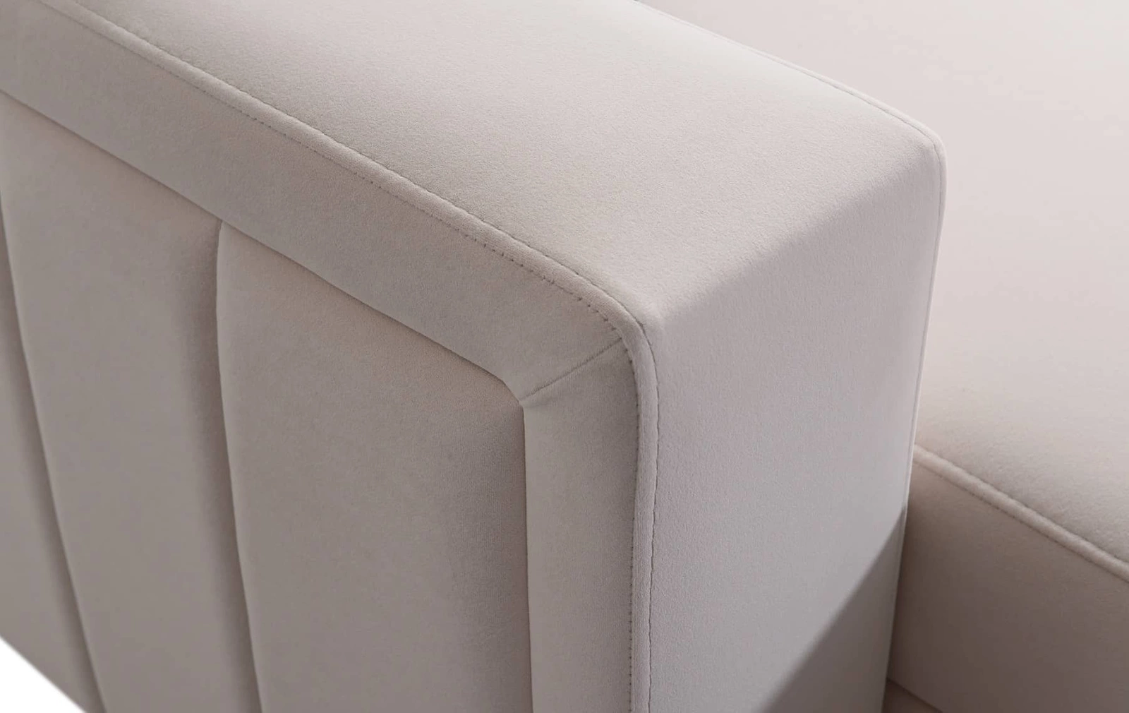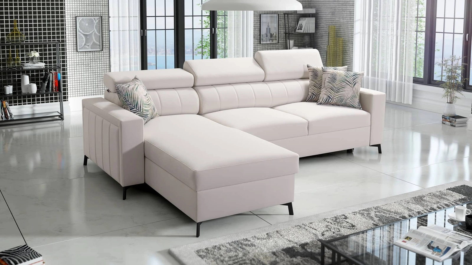 Rohová sedací souprava s funkcí spaní Savona krémová levá pohodlná a elegantní rohová sedací souprava s nastavitelnými opěrkami hlavy dekorativní prošívání