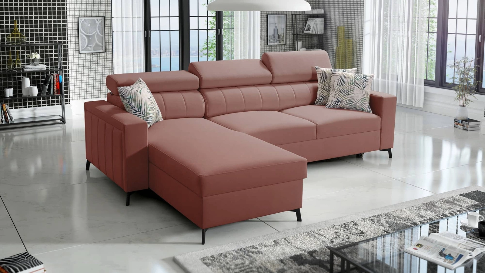Rohová sedací souprava s funkcí spaní Savona Indian pink levá pohodlná a elegantní rohová sedací souprava s nastavitelnými opěrkami hlavy dekorativní prošívání