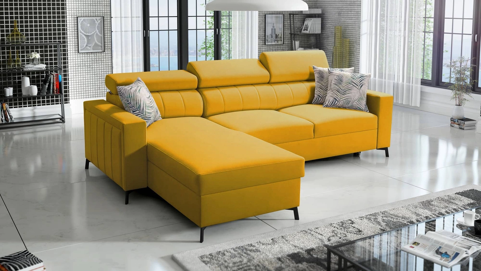 Rohová sedací souprava s funkcí spaní Savona žlutá levá pohodlná a elegantní rohová sedací souprava s nastavitelnými opěrkami hlavy dekorativní prošívání