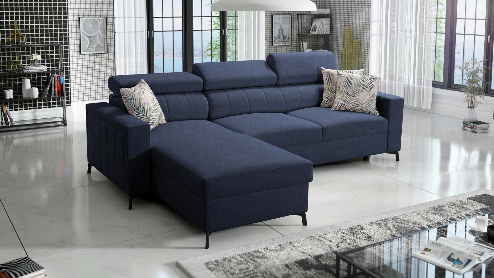 Rohová pohovka Savona v tmavě modré barvě s nastavitelnými opěrkami hlavy je elegantní kus nábytku, který se hodí do každého interiéru.