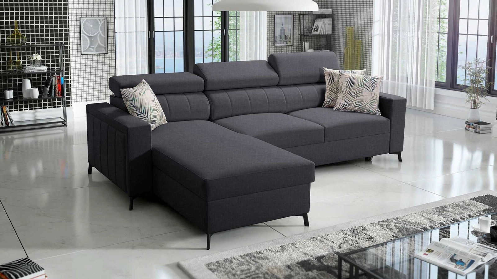 Rozkládací pohovka Savona grafitová levá pohodlná a elegantní rohová pohovka s nastavitelnými opěrkami hlavy dekorativní prošívání