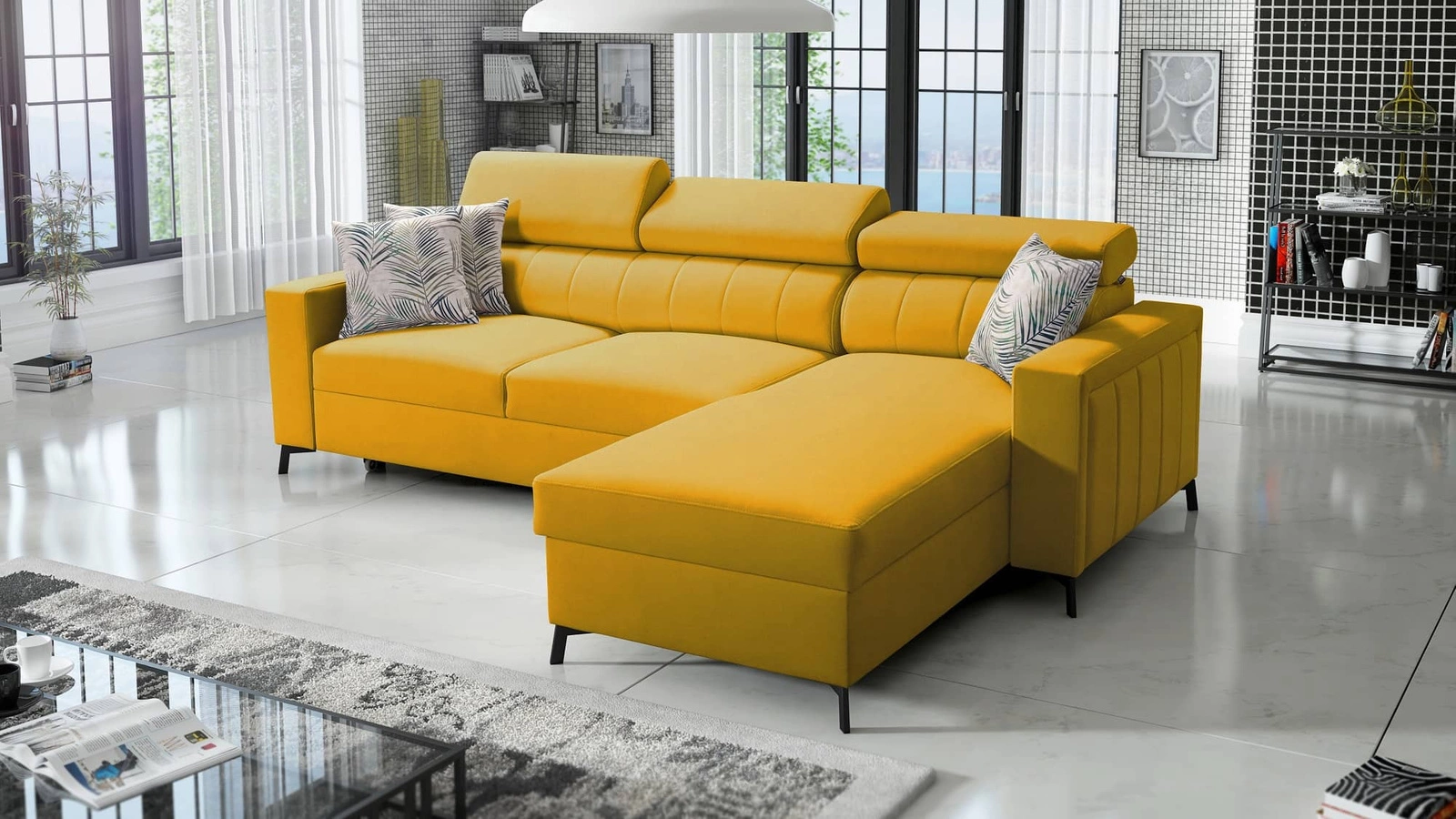 Rohová sedací souprava s funkcí spaní Savona žlutá pravá pohodlná a elegantní rohová sedací souprava s nastavitelnými opěrkami hlavy dekorativní prošívání