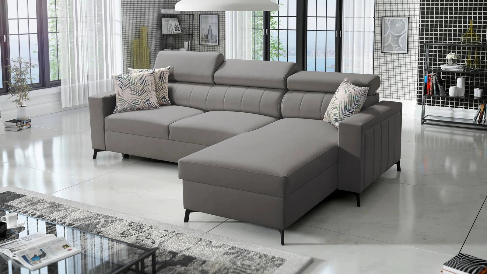 Rohová pohovka Savona v šedé barvě s nastavitelnými opěrkami hlavy je elegantní kus nábytku, který se hodí do každého interiéru.