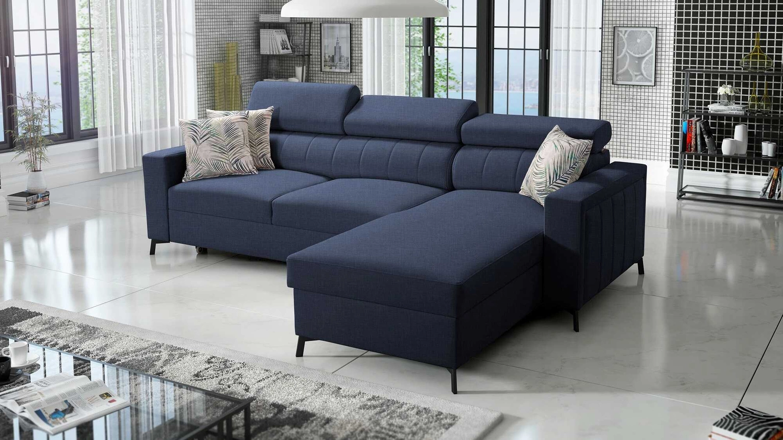 Rohová pohovka Savona v tmavě modré barvě s nastavitelnými opěrkami hlavy je elegantní kus nábytku, který se hodí do každého interiéru.
