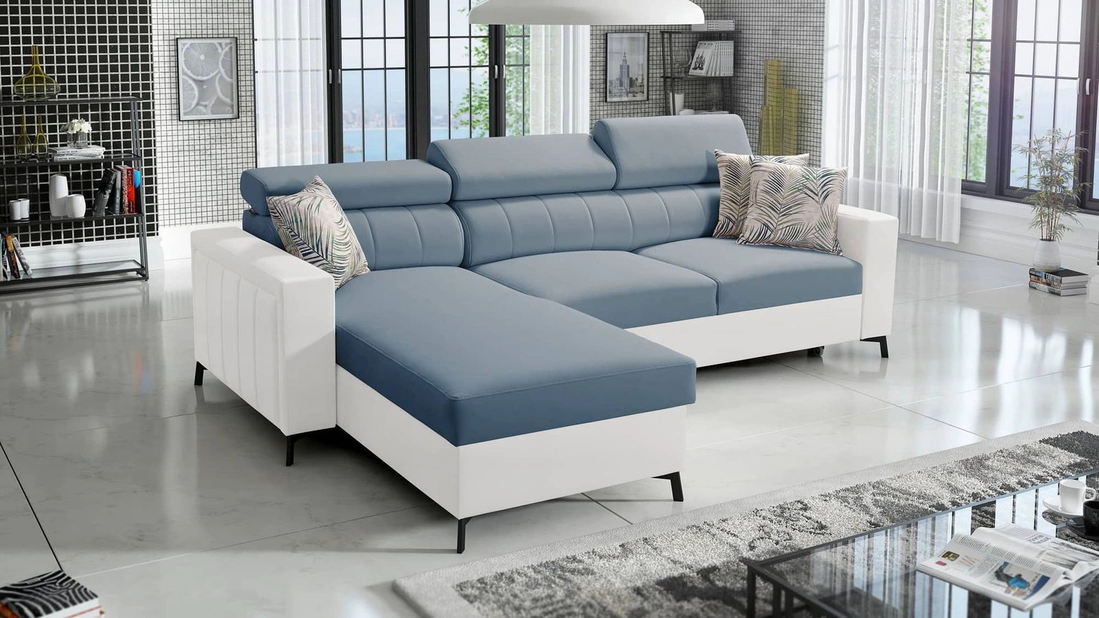 Rohová sedací souprava s funkcí spaní Savona modrá / bílá levá elegantní rohová sedací souprava s nastavitelnými opěrkami hlavy dekorativní prošívání