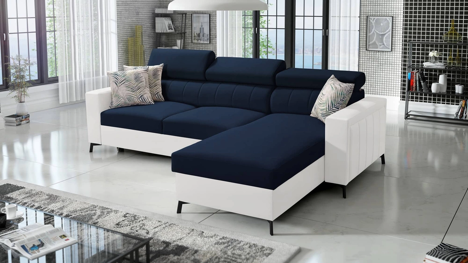 Rohová pohovka Savona v tmavě modré / bílé barvě s nastavitelnými opěrkami hlavy je elegantní kus nábytku, který se hodí do každého interiéru.