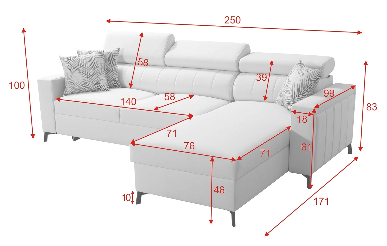 Rozměry nábytku jsou optimální. Šířka rohu 250 cm, maximální výška 100 cm a hloubka 171 cm. Spací plocha rohové jednotky je 128x210 cm. Výška sedadla nábytku je 46 cm a maximální výška opěradla je 58 cm. Vlnité pružiny a polyuretanová pěna T30 je materiál, z něhož je vyrobeno sedadlo rohu. Pevné opěradlo s nastavitelnými opěrkami hlavy zaručuje pohodlný odpočinek po dlouhém dni, který oceníte vy, vaši blízcí i hosté, kteří si na tuto jedinečnou rohovou sedačku sednou!