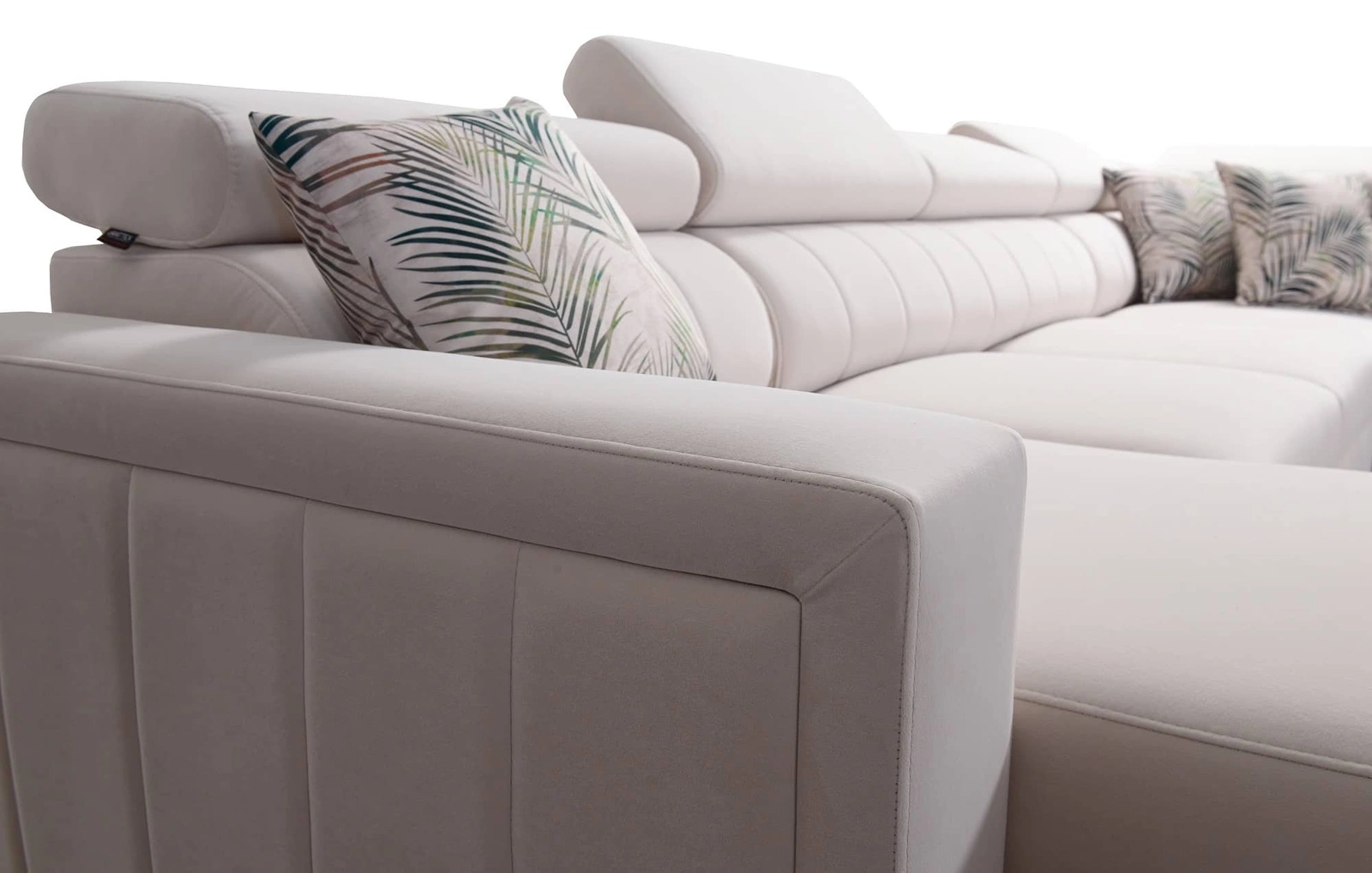 Rohová pohovka Savona VI v krémové barvě s nastavitelnými opěrkami hlavy kombinuje funkčnost s mimořádně elegantním tvarem.