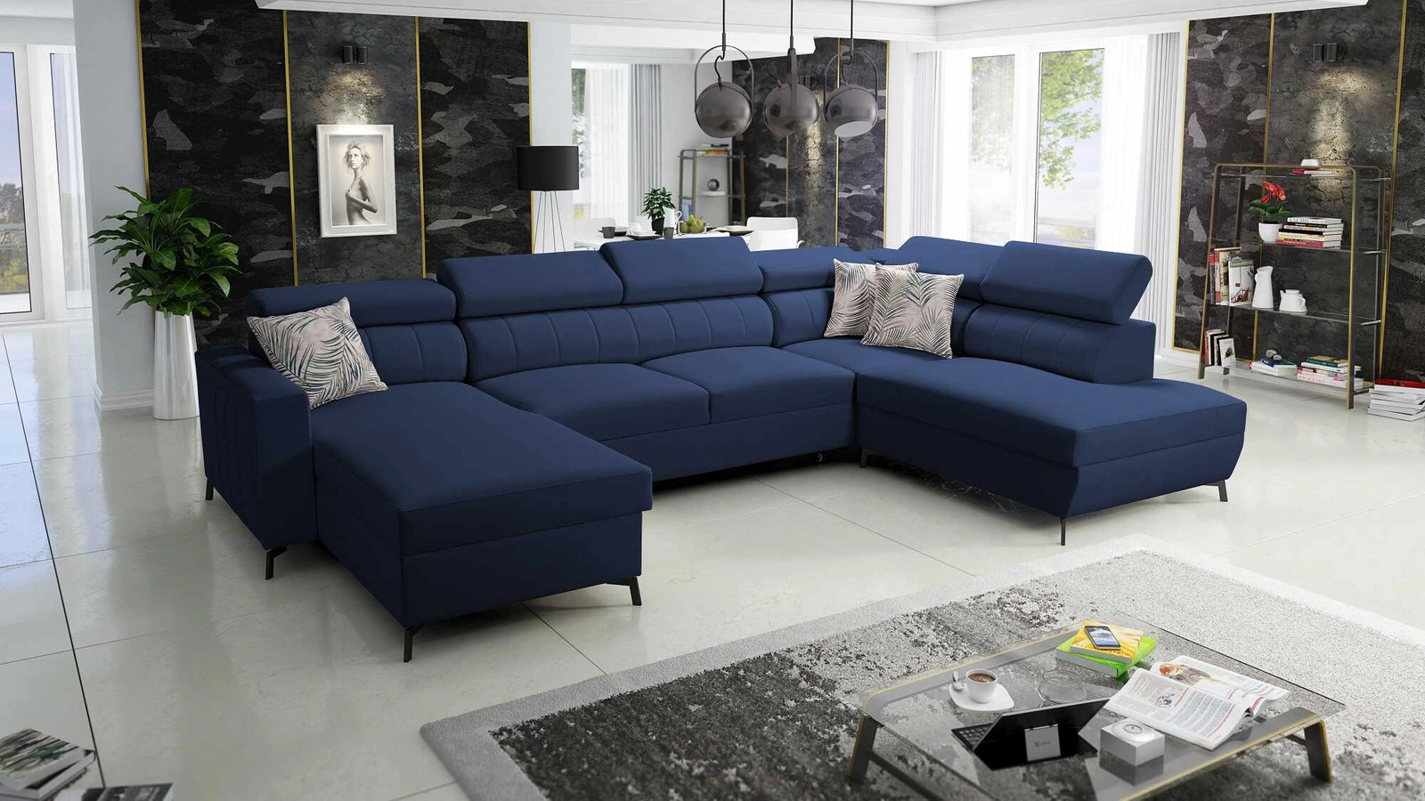 Rohová pohovka Savona VI v modré barvě s nastavitelnými opěrkami hlavy kombinuje funkčnost s mimořádně elegantním tvarem.