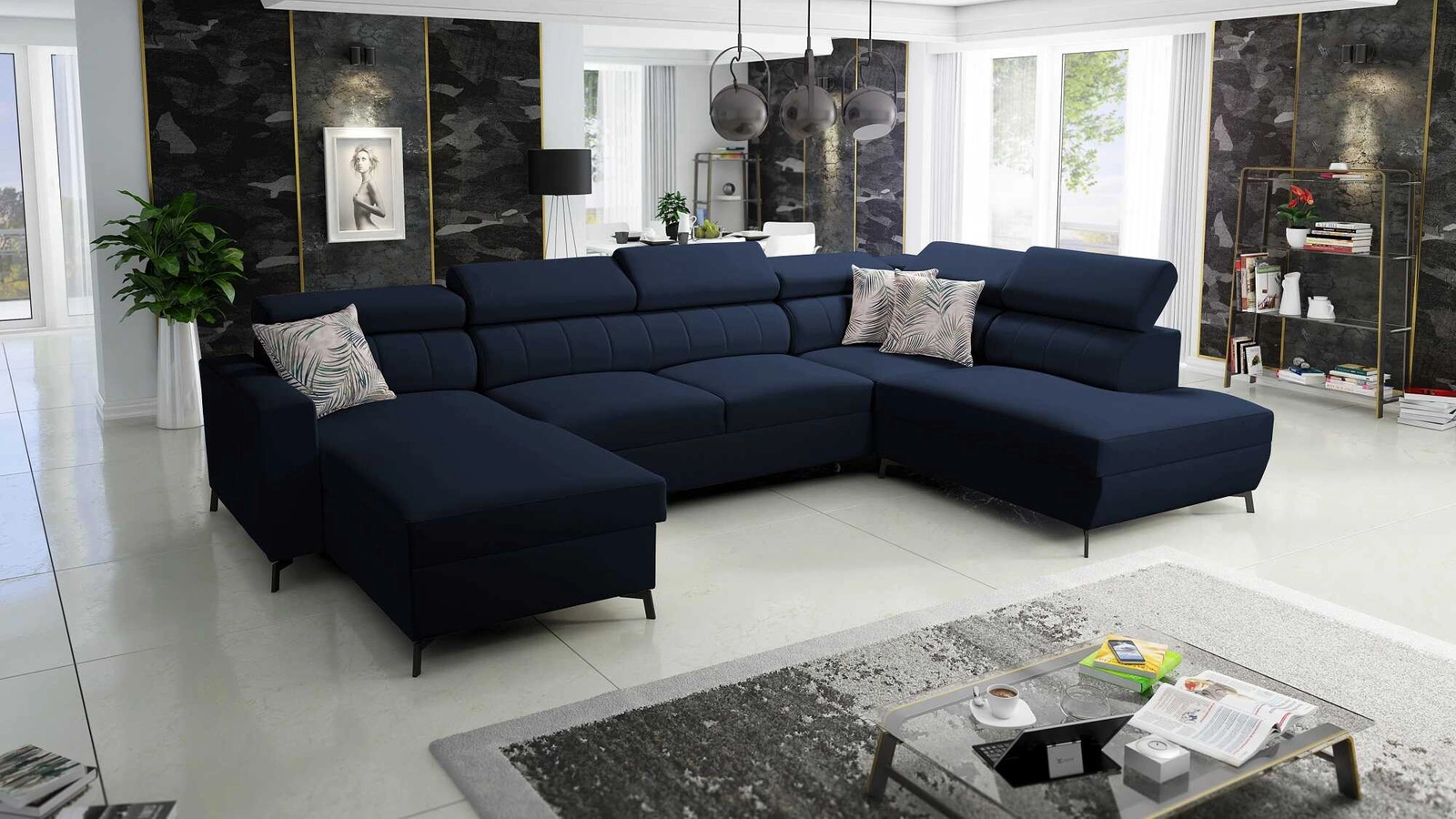 Rohová pohovka Savona VI v tmavě modré barvě s nastavitelnými opěrkami hlavy kombinuje funkčnost s mimořádně elegantní formou.