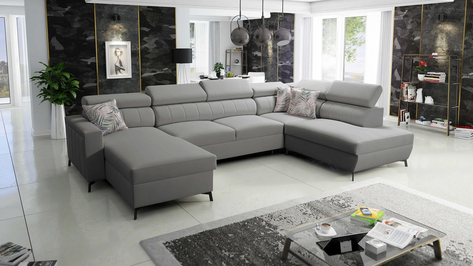 Rohová pohovka Savona VI v šedé barvě s nastavitelnými opěrkami hlavy kombinuje funkčnost s mimořádně elegantním tvarem.