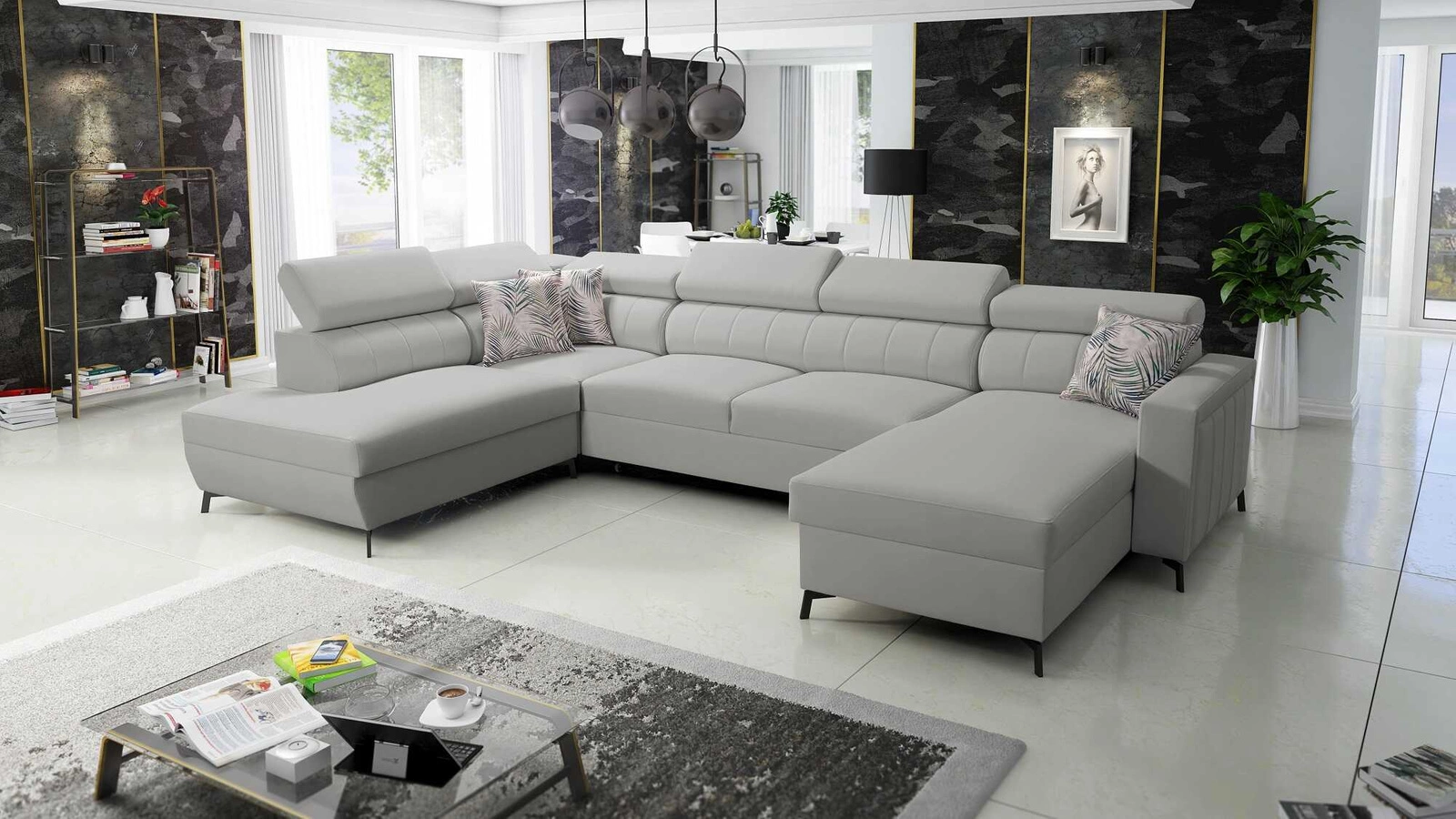 Rohová pohovka Savona VI v šedém jasanu s nastavitelnými opěrkami hlavy kombinuje funkčnost s mimořádně elegantním tvarem.