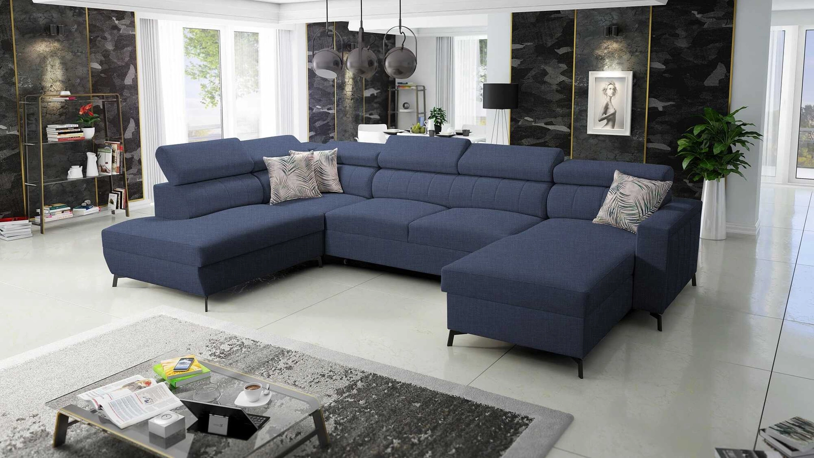 Rohová pohovka Savona VI v tmavě modré barvě s nastavitelnými opěrkami hlavy kombinuje funkčnost s mimořádně elegantní formou.