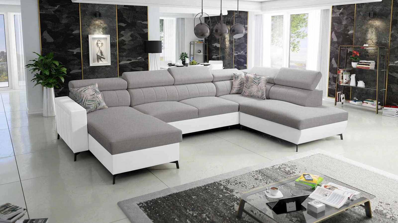 Rohová pohovka Savona VI ve světle šedé / bílé barvě s nastavitelnými opěrkami hlavy kombinuje funkčnost s mimořádně elegantním tvarem.