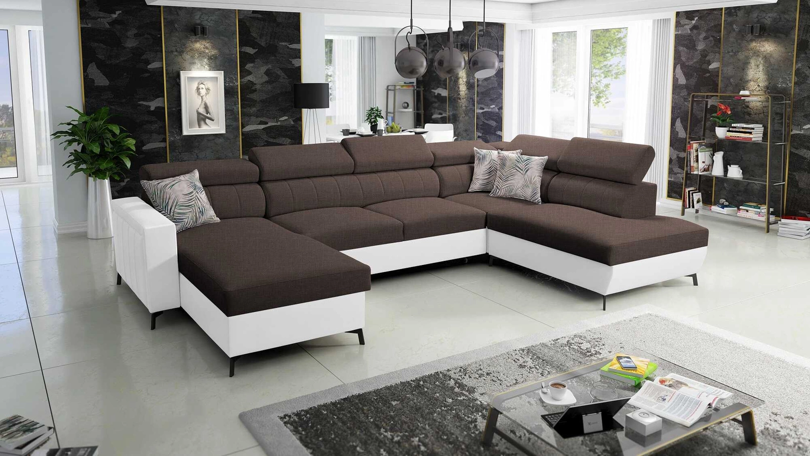 Rohová pohovka Savona VI v hnědé / bílé barvě s nastavitelnými opěrkami hlavy kombinuje funkčnost s mimořádně elegantním tvarem.