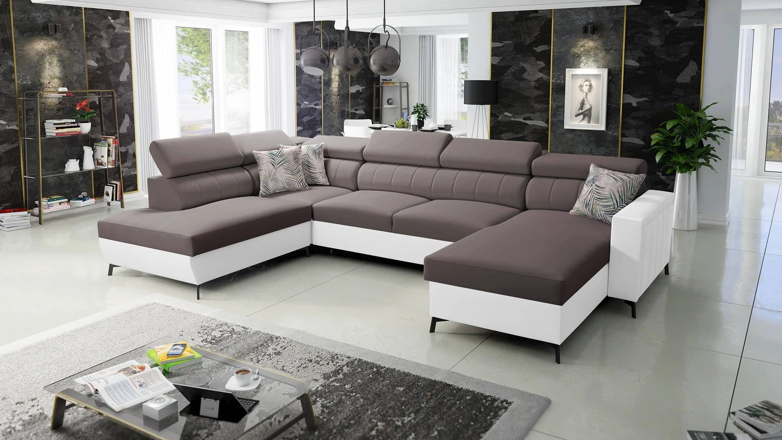 Rohová pohovka Savona VI v hnědé / bílé barvě s nastavitelnými opěrkami hlavy kombinuje funkčnost s mimořádně elegantním tvarem.