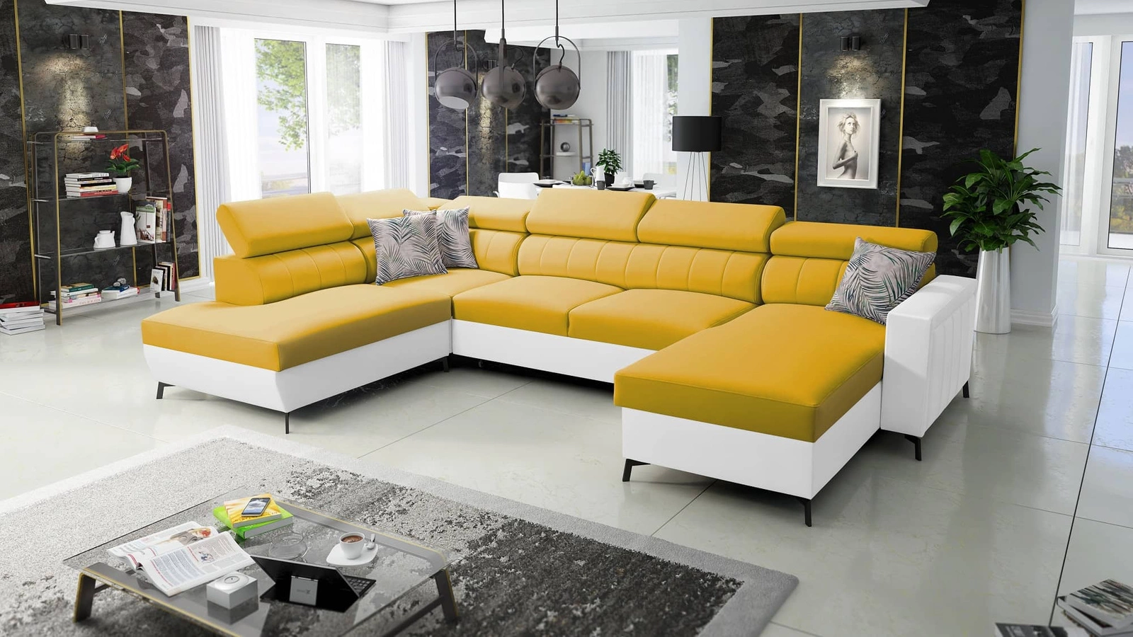 Rohová pohovka Savona VI ve žluté/bílé barvě s nastavitelnými opěrkami hlavy kombinuje funkčnost s mimořádně elegantním tvarem.
