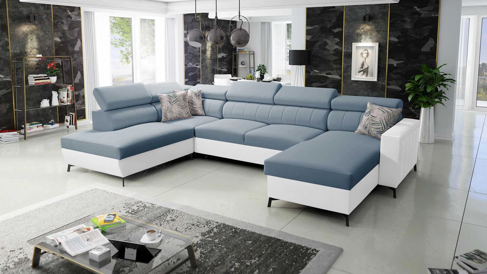 Rohová pohovka Savona VI v modré / bílé barvě s nastavitelnými opěrkami hlavy kombinuje funkčnost s mimořádně elegantním tvarem.