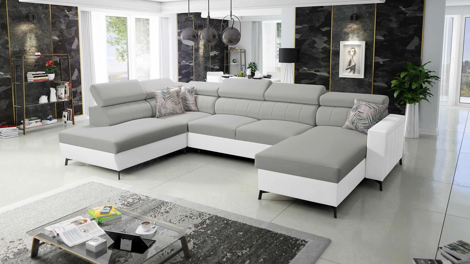 Rohová pohovka Savona VI v barvě šedý jasan/bílá s nastavitelnými opěrkami hlavy kombinuje funkčnost s mimořádně elegantní formou.