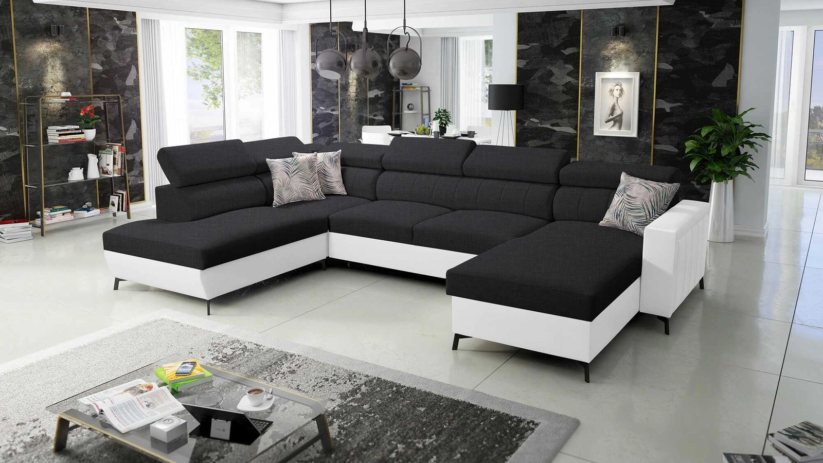 Rohová pohovka Savona VI v černé / bílé barvě s nastavitelnými opěrkami hlavy kombinuje funkčnost s mimořádně elegantním tvarem.