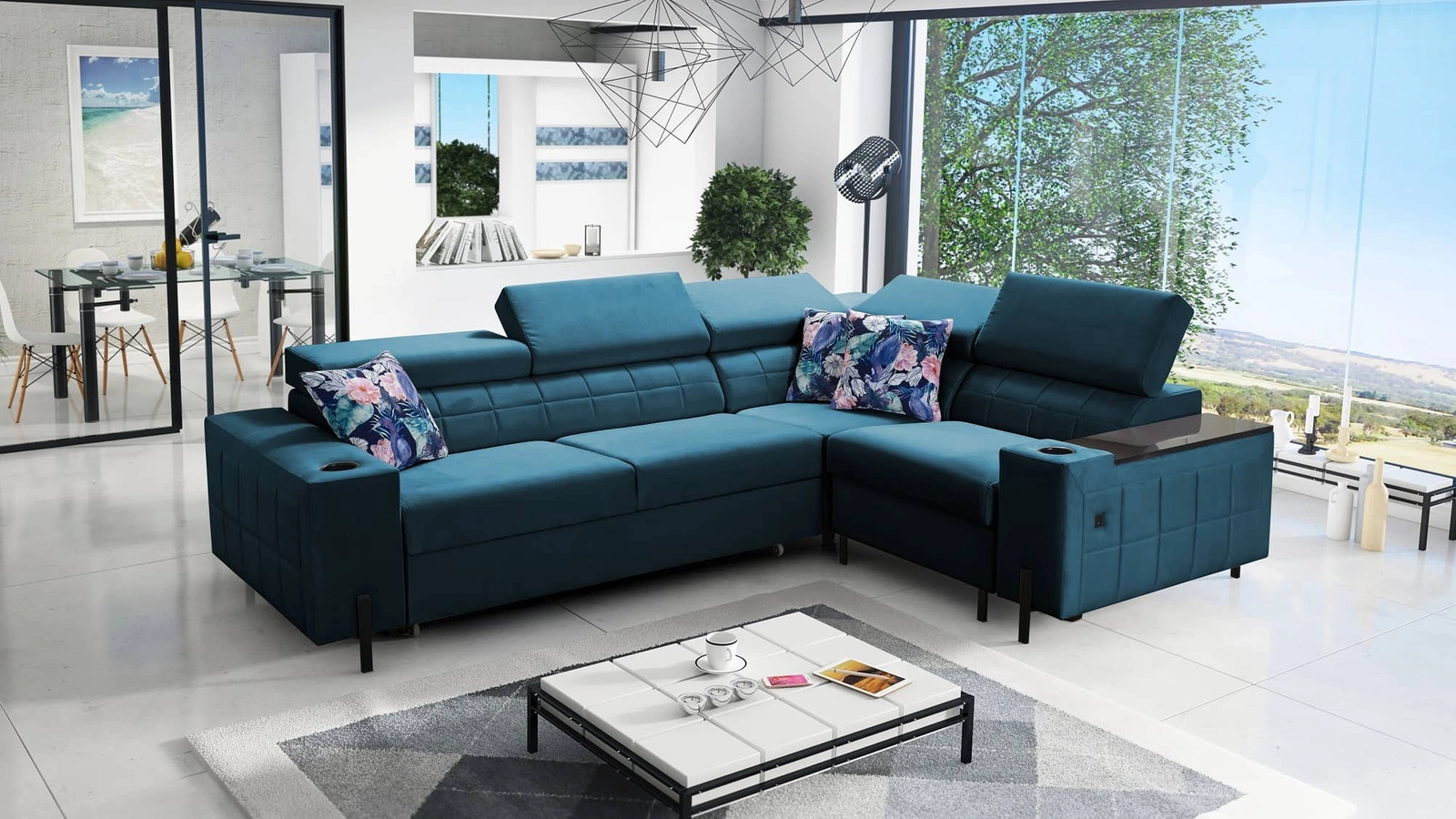 Rohová pohovka Belvi II v tyrkysové barvě s nastavitelnými opěrkami hlavy je elegantní kus nábytku, který se hodí do každého interiéru.