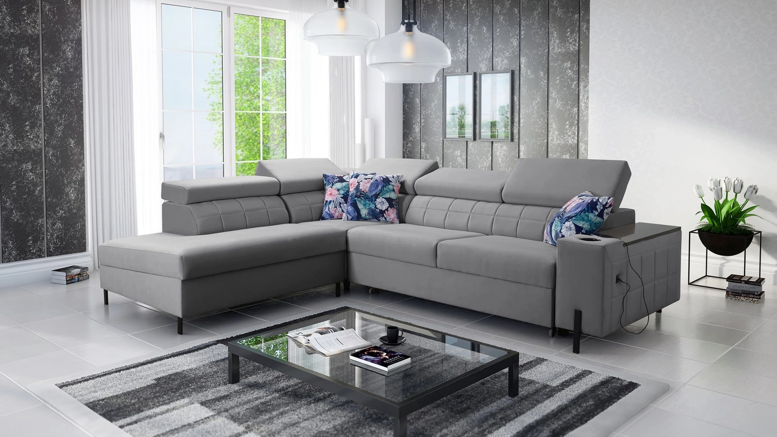 Rohová sedací souprava s funkcí spaní Belvi III šedá levá pohodlná a elegantní rohová sedací souprava do obývacího pokoje s praktickým úložným prostorem na boku