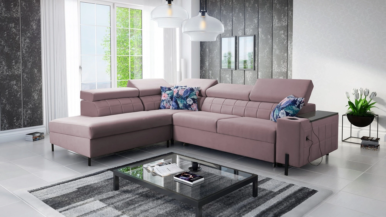 Rohová pohovka Belvi III ve vřesové barvě s nastavitelnými opěrkami hlavy je elegantní kus nábytku, který se hodí do každého interiéru.