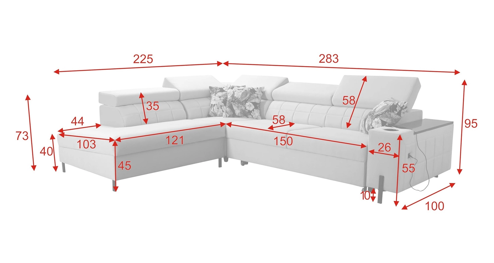 Rohová pohovka s funkcí spaní Belvi III je kombinací moderního a elegantního tvaru, který se bude hodit do každého moderního interiéru. Rozměry nábytku jsou optimální. Šířka rohu 283 cm, maximální výška 95 cm a hloubka 225 cm. Spací plocha rohové jednotky je 127x210 cm. Výška sedadla nábytku je 45 cm a maximální výška opěradla je 58 cm.