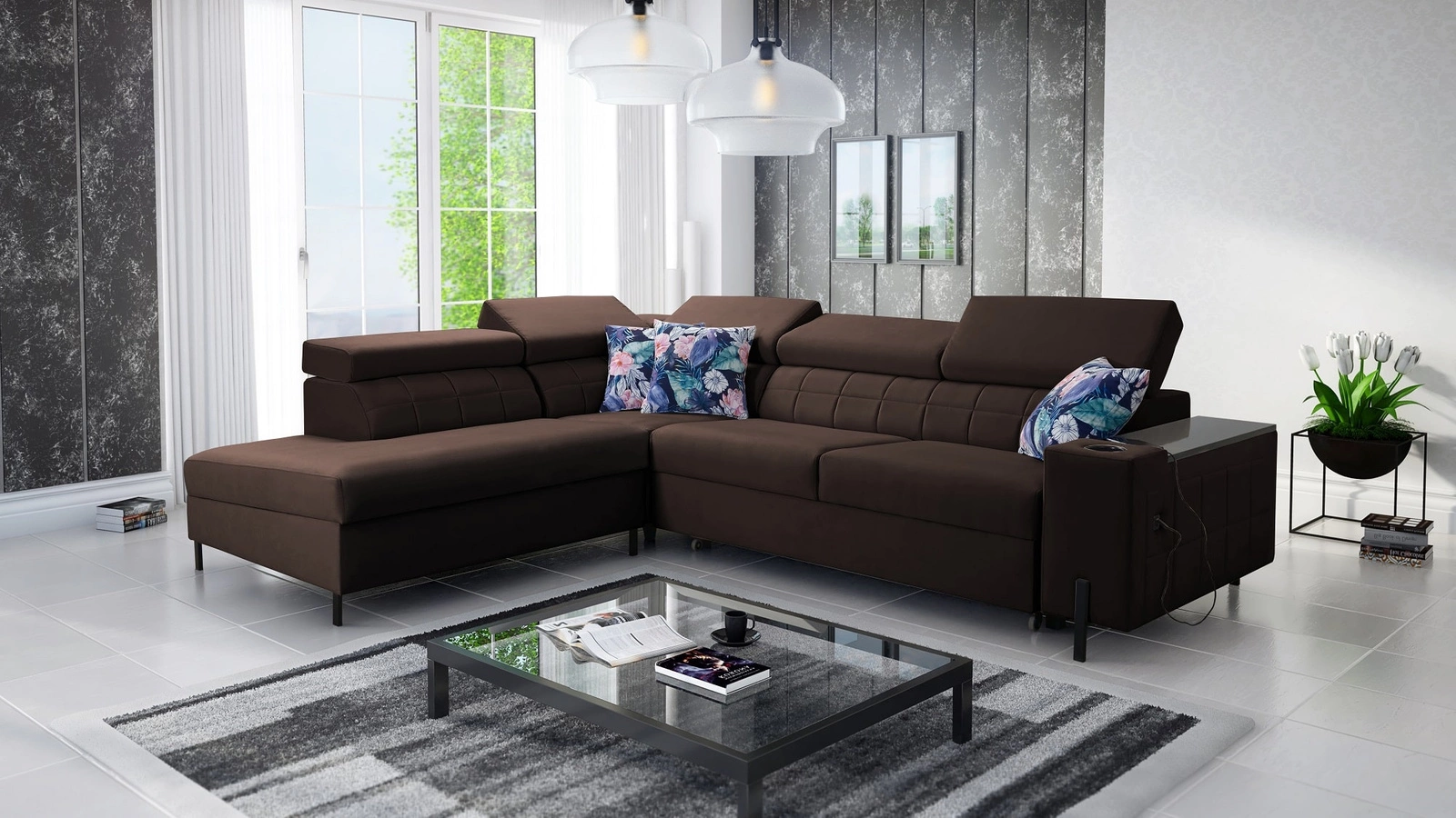 Rohová sedací souprava s funkcí spaní Belvi III hnědá levá strana pohodlná a elegantní rohová sedací souprava do obývacího pokoje s praktickým úložným prostorem v boční části