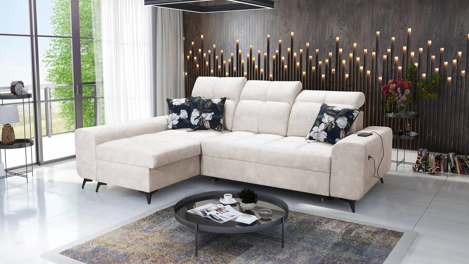 Mezi doplňky tohoto nábytku, které ocení všichni uživatelé, patří kontejner na lůžkoviny, nastavitelné opěrky hlavy a nabíjecí zásuvka USB v boční části rohové skříně.
