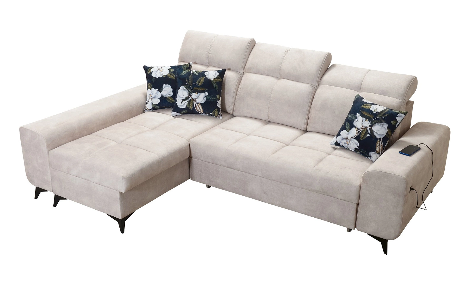 Mezi doplňky tohoto nábytku, které ocení všichni uživatelé, patří kontejner na lůžkoviny, nastavitelné opěrky hlavy a nabíjecí zásuvka USB v boční části rohové skříně.