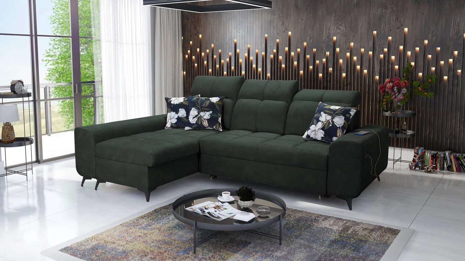 Rohová sedací souprava s funkcí spaní Buffalo green left Funkční a stylová rohová sedací souprava s kontejnerem na lůžkoviny