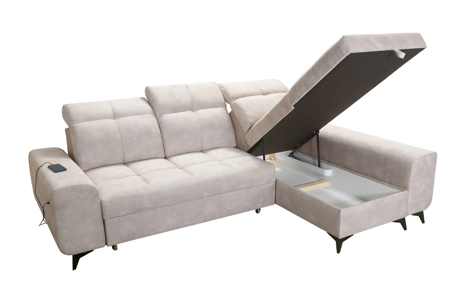 Mezi doplňky tohoto nábytku, které ocení všichni uživatelé, patří kontejner na lůžkoviny, nastavitelné opěrky hlavy a nabíjecí zásuvka USB v boční části rohové skříně.