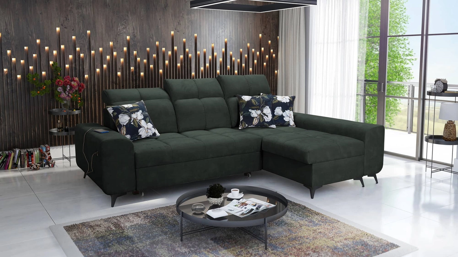 Rohová pohovka s funkcí spaní Buffalo green right Funkční a stylová rohová pohovka s kontejnerem na lůžkoviny