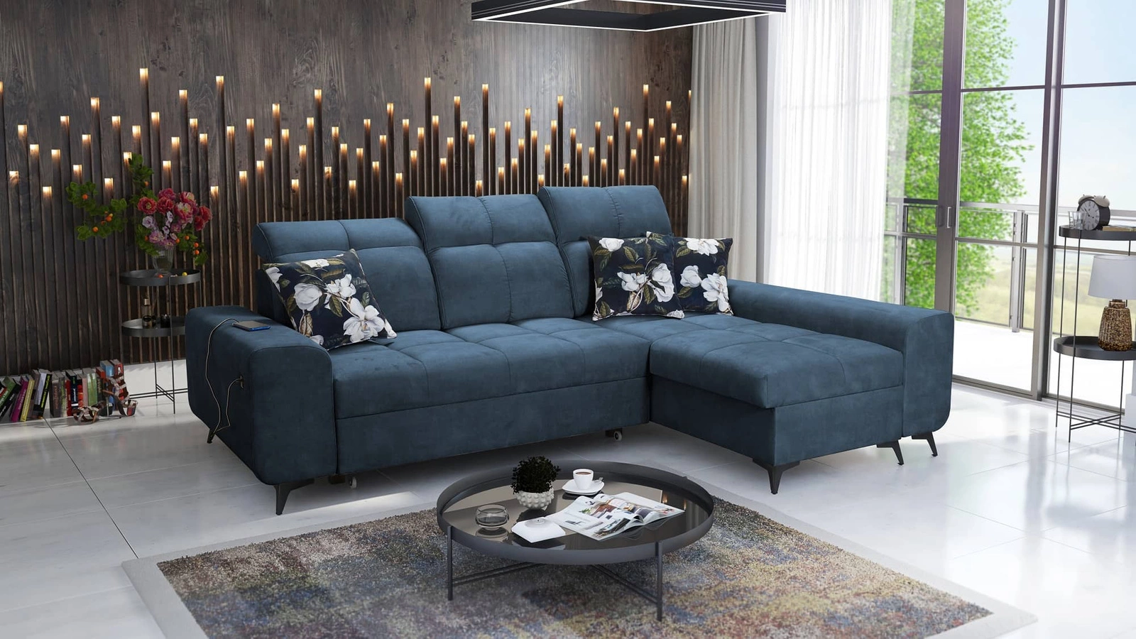 Rohová pohovka Buffalo v modré barvě s nastavitelnými opěrkami hlavy je zajímavě vypadající kus nábytku s elegantním povrchem.