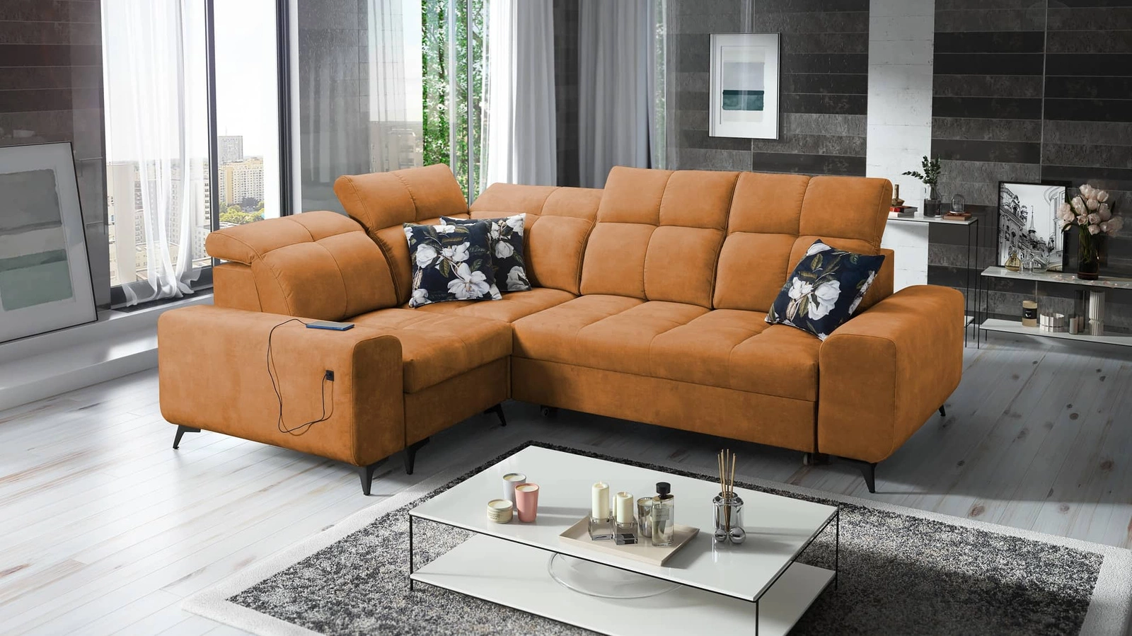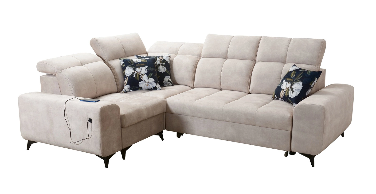 Mezi doplňky tohoto nábytku, které ocení všichni uživatelé, patří kontejner na lůžkoviny, nastavitelné opěrky hlavy a nabíjecí zásuvka USB v boční části rohové skříně.