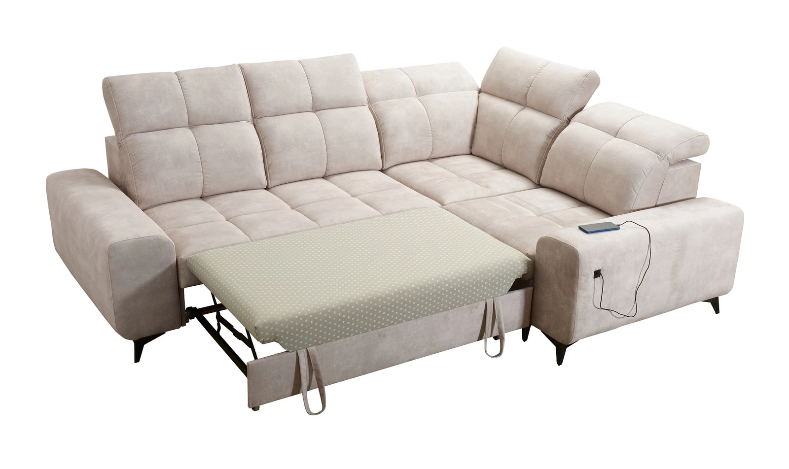 Mezi doplňky tohoto nábytku, které ocení všichni uživatelé, patří kontejner na lůžkoviny, nastavitelné opěrky hlavy a nabíjecí zásuvka USB v boční části rohové skříně.