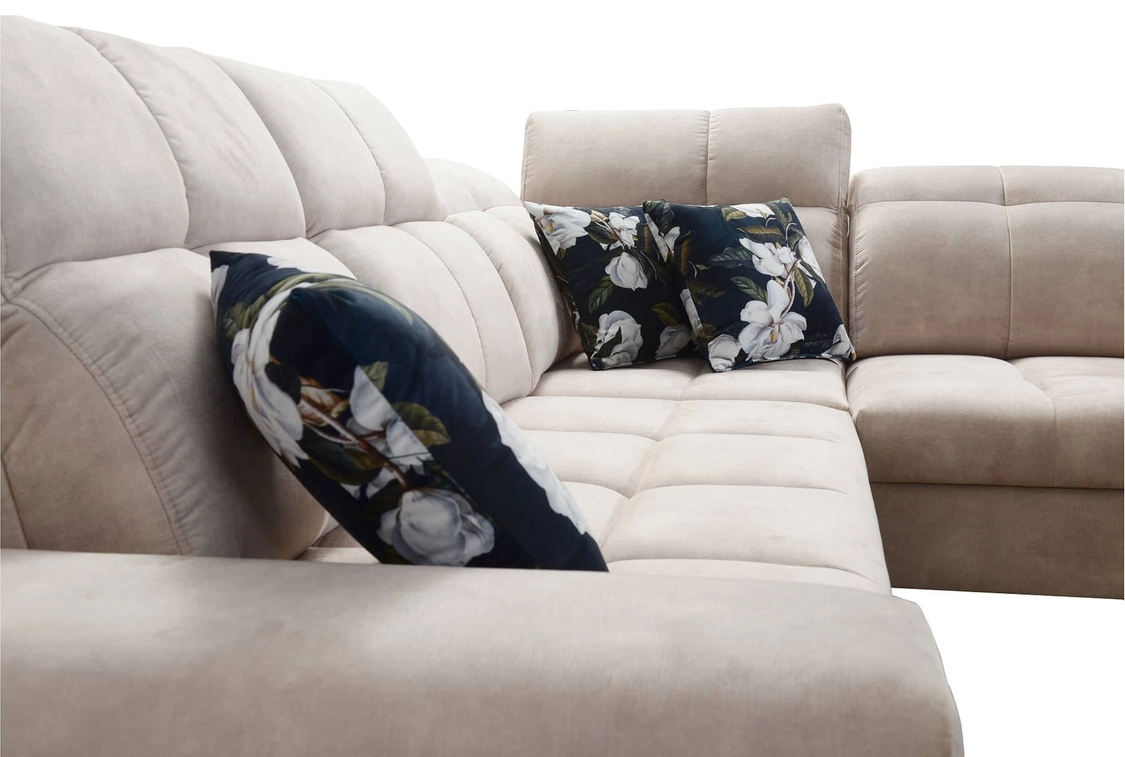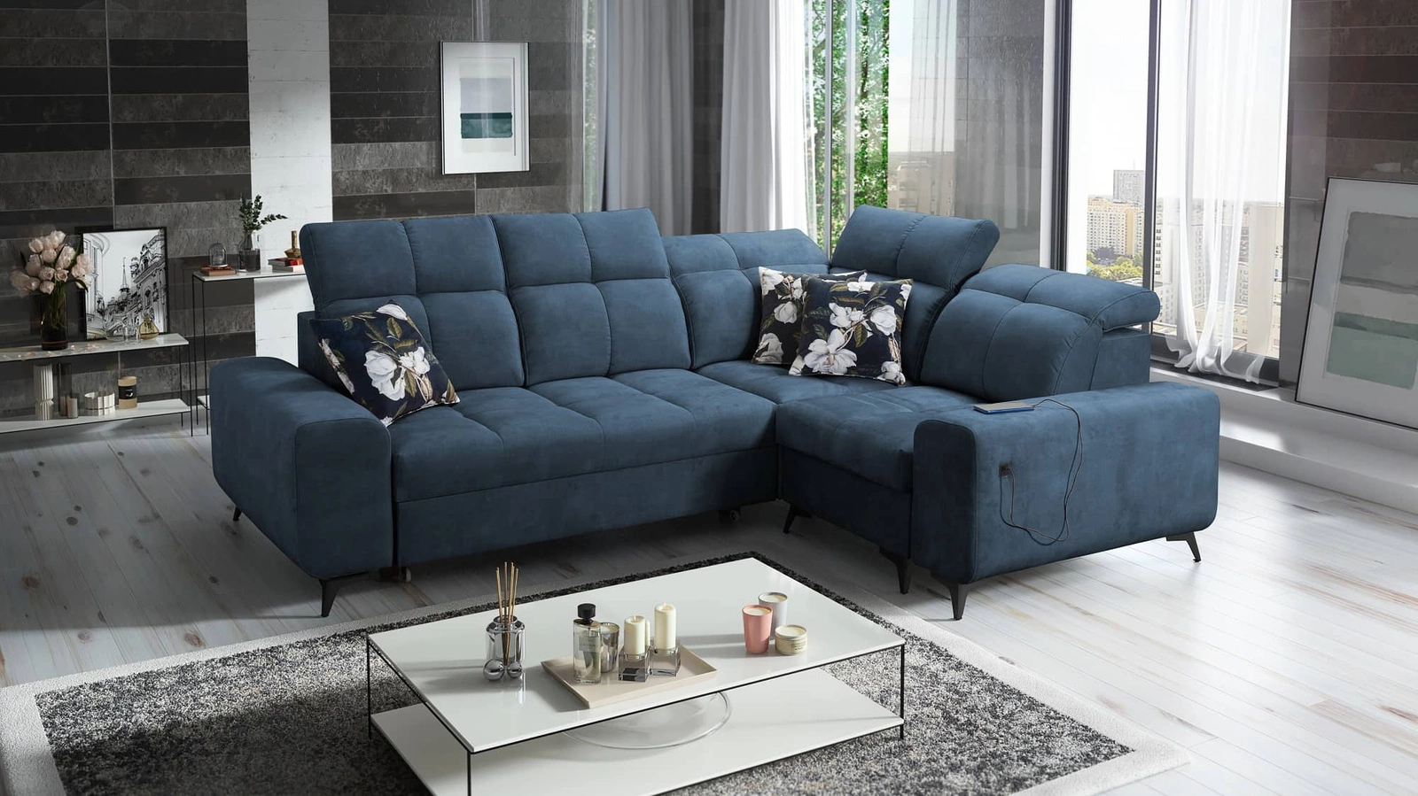 Mezi doplňky tohoto nábytku, které ocení všichni uživatelé, patří kontejner na lůžkoviny, nastavitelné opěrky hlavy a nabíjecí zásuvka USB v boční části rohové skříně.